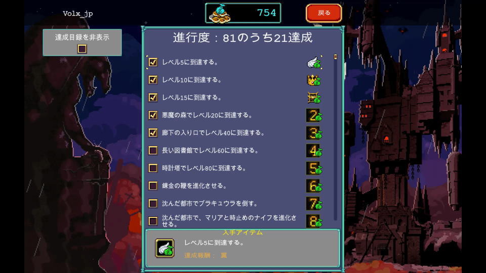 上の条件を消化する過程でいくつか「悪魔城ドラキュラへの頌歌のクリア」を試してみたところ、全て失敗。
