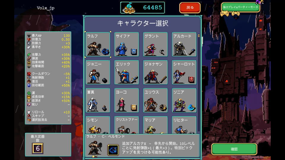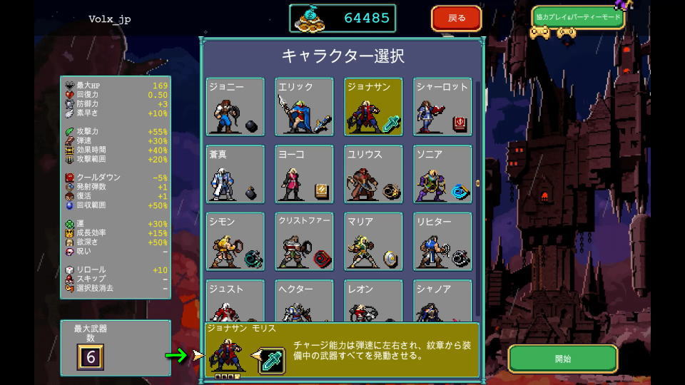 予告されていたv1.14アップデートとともに追加された、Vampire Survivorsの悪魔城ドラキュラコラボ。