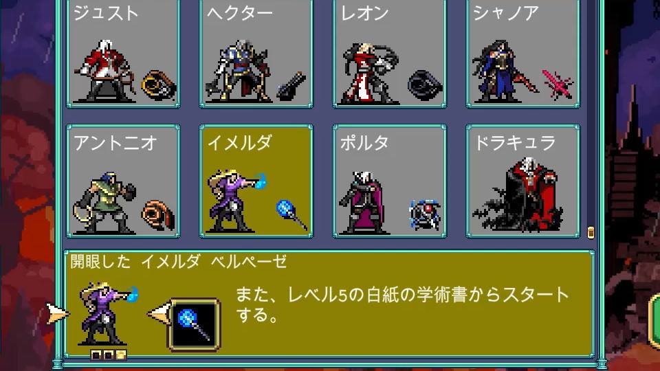 ヴラド・ツェペシュ ドラキュラ | レベルごとに攻撃力+1%。100レベルごとに回復力+1。呪いにより攻撃力が増加。受けるダメージの上限は10。HP消費への耐性あり | ワイングラス エボニー・ディアボローグ |