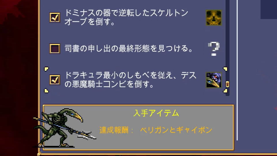 ベリガンとギャイボンの解除条件は「ドラキュラ最小のしもべを従え、デスの悪魔騎士コンビを倒す」です。