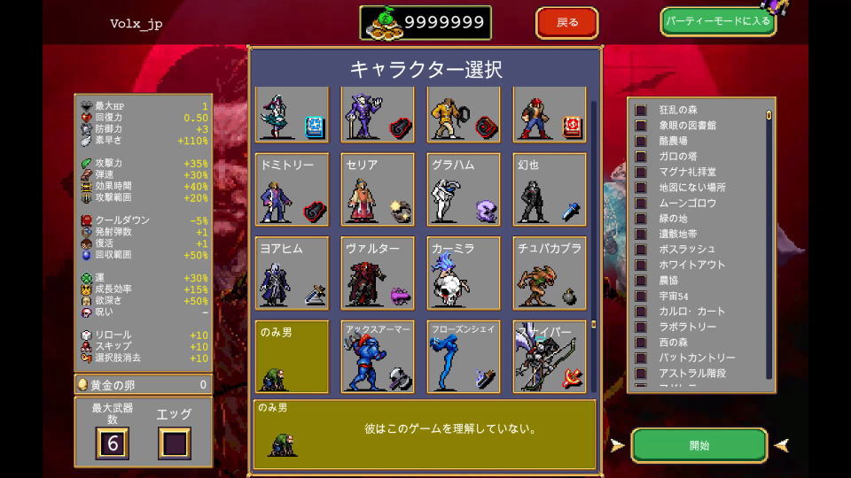 ベリガンとギャイボンを解除する準備として、まずプレイするキャラクターに「のみ男」を選択します。