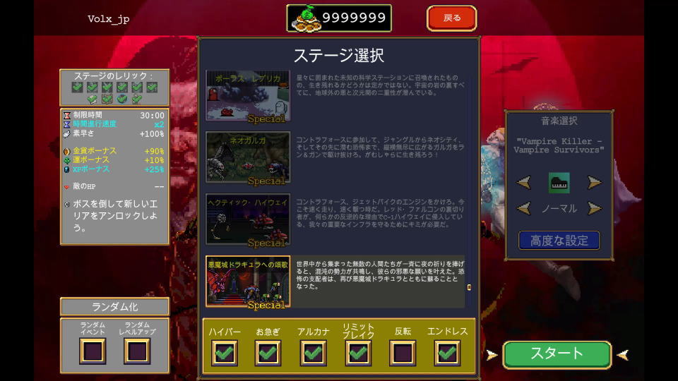つぎにプレイするステージに「悪魔城ドラキュラへの頌歌」を指定します。
