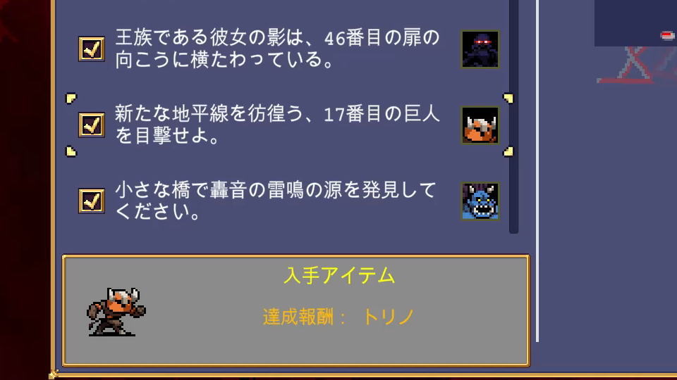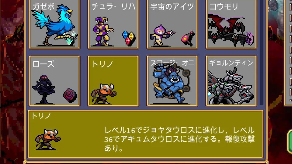 途中のレベルアップでは復活回数が増える「ティラギス」や、被ダメージを抑える「鎧」を選択します。