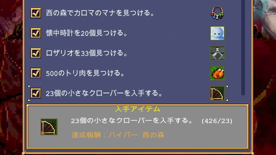 ベータ版では上記のとおり20個でしたが、製品版では「23個の小さなクローバーを入手する」です。