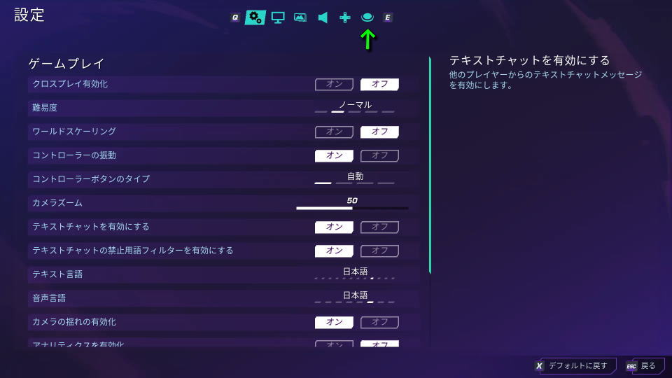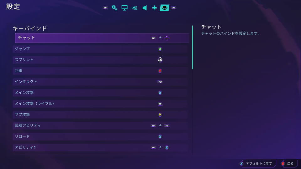 | チャット | LB + 方向パッド上 | L1 + 方向キー上 |