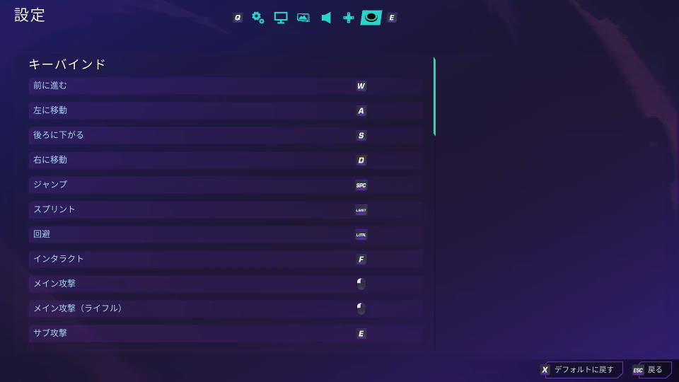 設定に移動したら、上部メニューの一番右にある「キーバインド」を選択します。