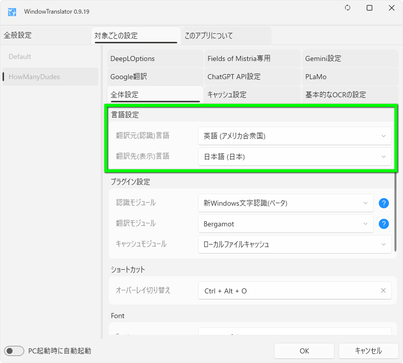 WindowTranslatorの設定画面が表示されたら「全体設定」の『言語設定』を確認します。