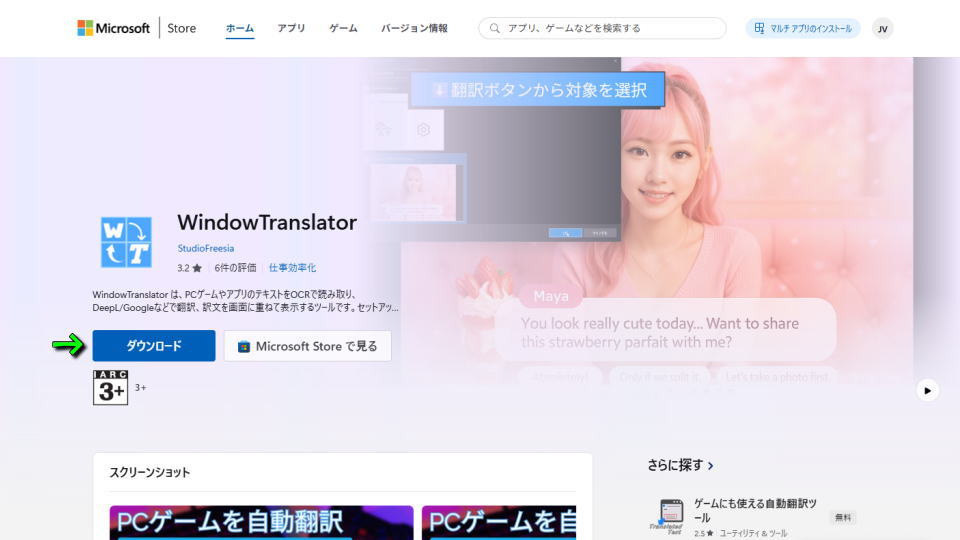 WindowTranslatorをダウンロードするため「Microsoft Store」にアクセスします。
