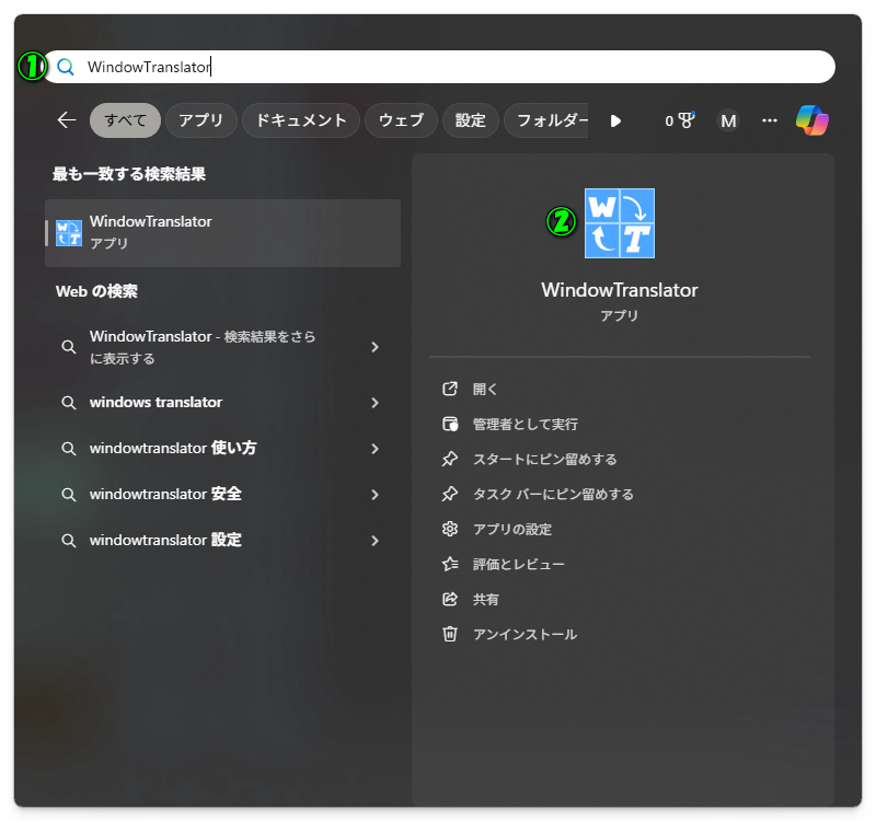 WindowTranslatorが自動で起動しない場合は、タスクバー左の「スタート」から「WindowTranslator」を検索して実行します。