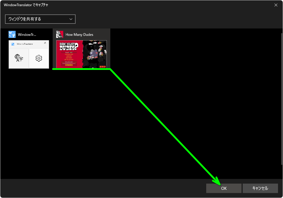 WindowTranslatorでキャプチャが表示されたら、日本語化したいゲームを指定します。