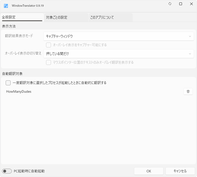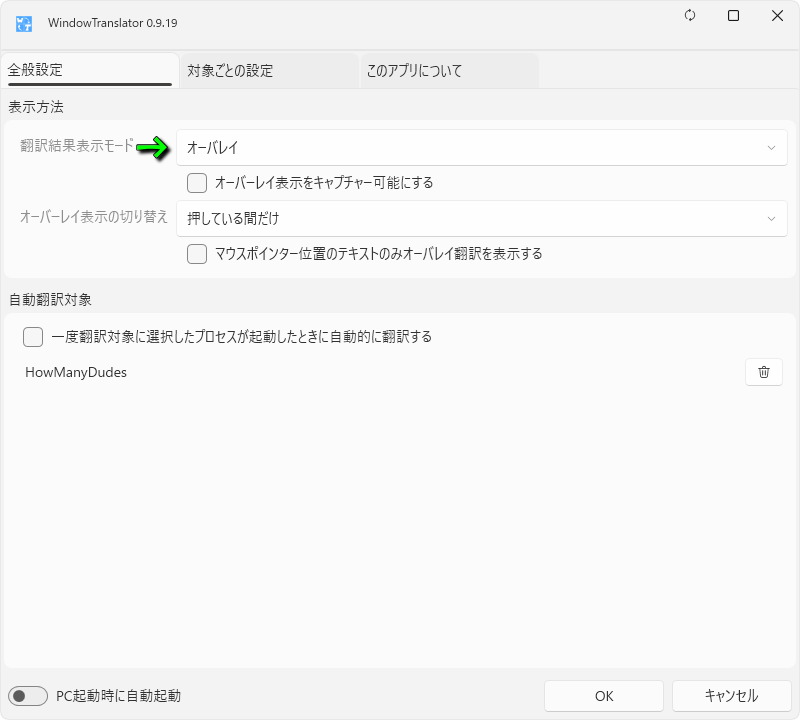 WindowTranslatorの全般設定では、翻訳結果の「表示方法」が変更できます。