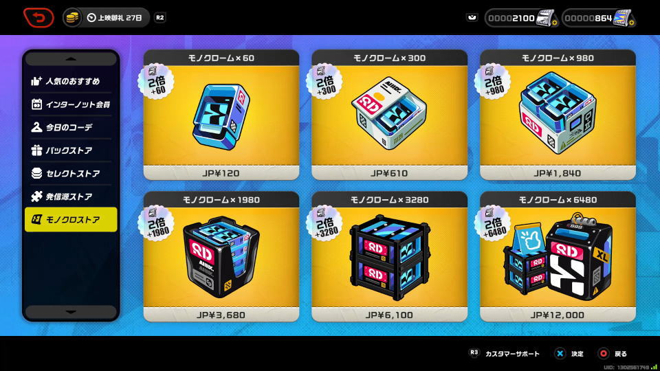それぞれのコンテンツを購入するための「モノクローム」を、リアルマネーと交換するストアです。